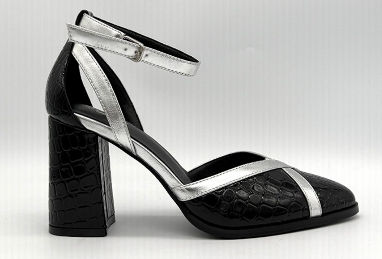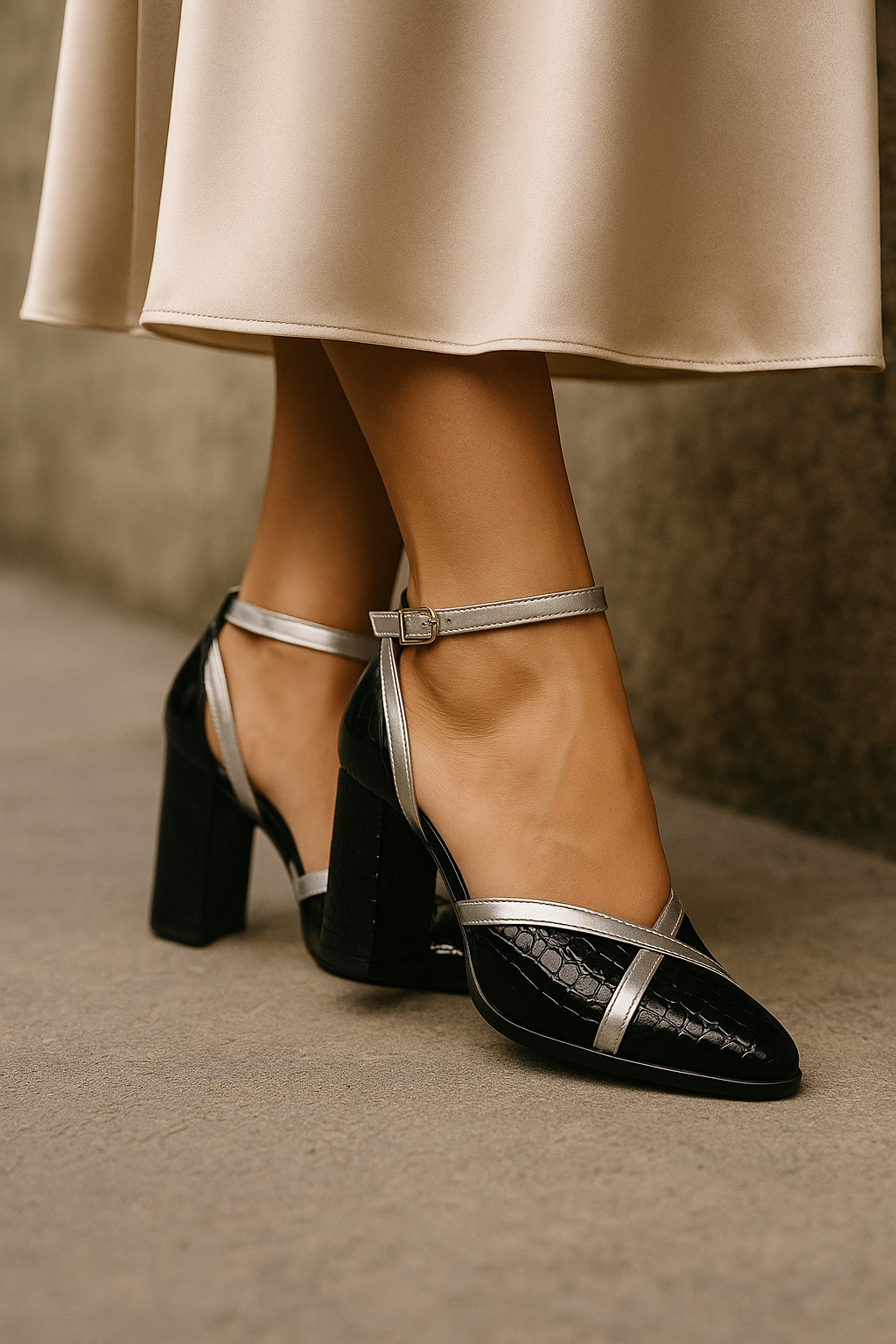 Tacos Eliana, perfectos para lucir elegante y cómoda. Con una altura de 7 cm, su taco cuadrado asegura estabilidad y su punta con detalles plateados brinda un efecto alargado. La textura añade un toque de elegancia a tus pasos. ¡Hazte con ellos y destaca con estilo!