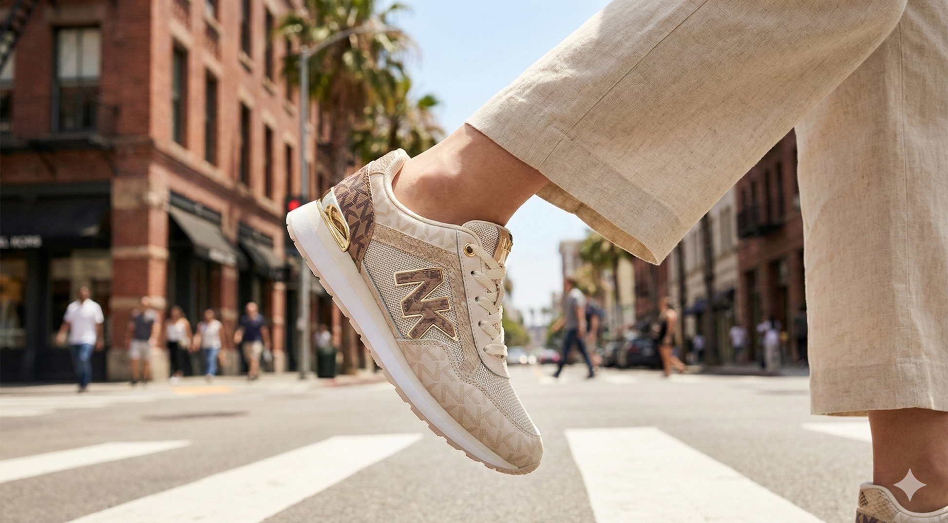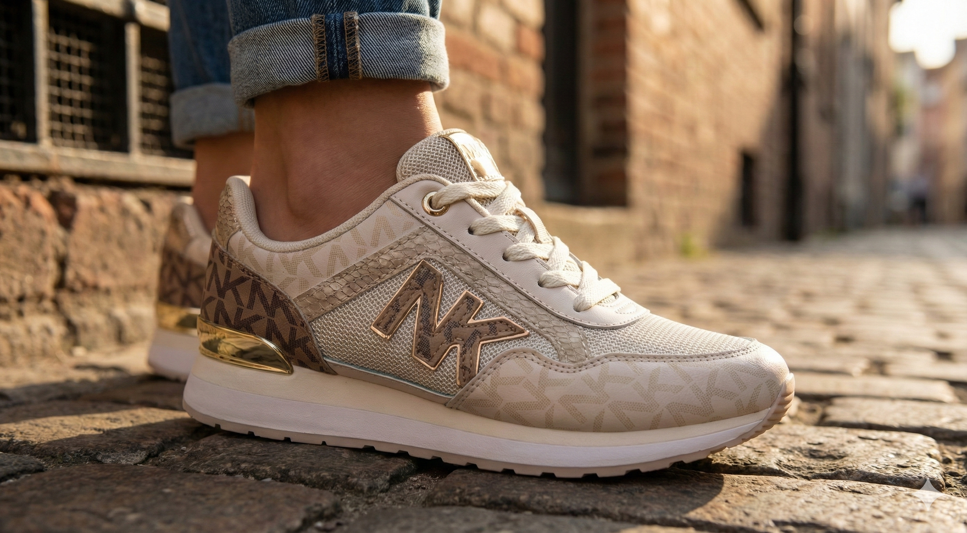 Diseño Monogram Chic: Estampado sutil de letras en tonos beige y detalle marrón en el talón que aporta un aire de exclusividad y tendencia.
