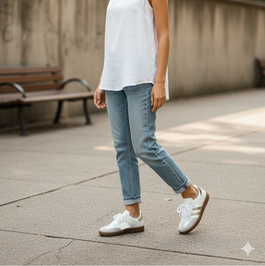 ✨💕 Dale un toque de brillo a tus básicos. Esta versión del clásico urbano incorpora franjas y talón en dorado metalizado, fusionando la comodidad deportiva con un acabado glamuroso perfecto para quienes aman destacar sin perder la sencillez.