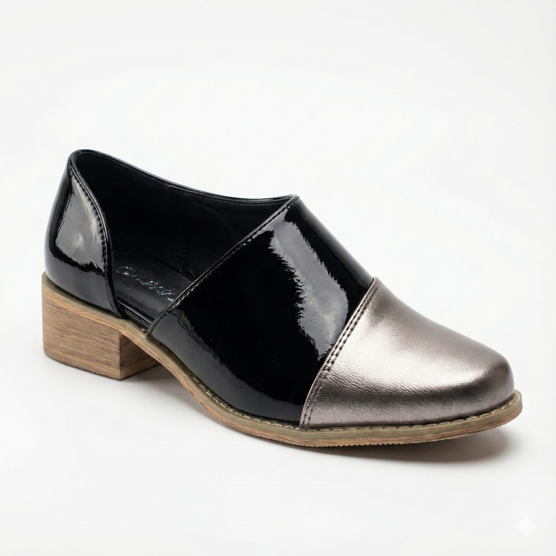 ✨💕 Dale un giro moderno a tus pasos con el diseño único de nuestros zapatos Lulu. Con un elegante acabado en charol y una puntera metalizada en contraste, estos zapatos estilo "cut-out" (con aberturas laterales) son la mezcla perfecta de frescura y sofisticación para destacar en la oficina o en tus salidas de fin de semana.